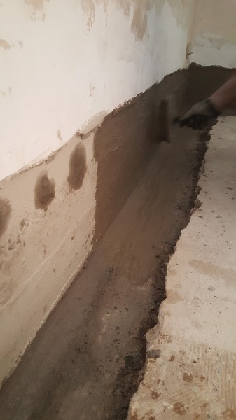 Hohkehleneinbau, Flächenabdichtung, Sanierputz und Einbau von Hydrosilikatplatten